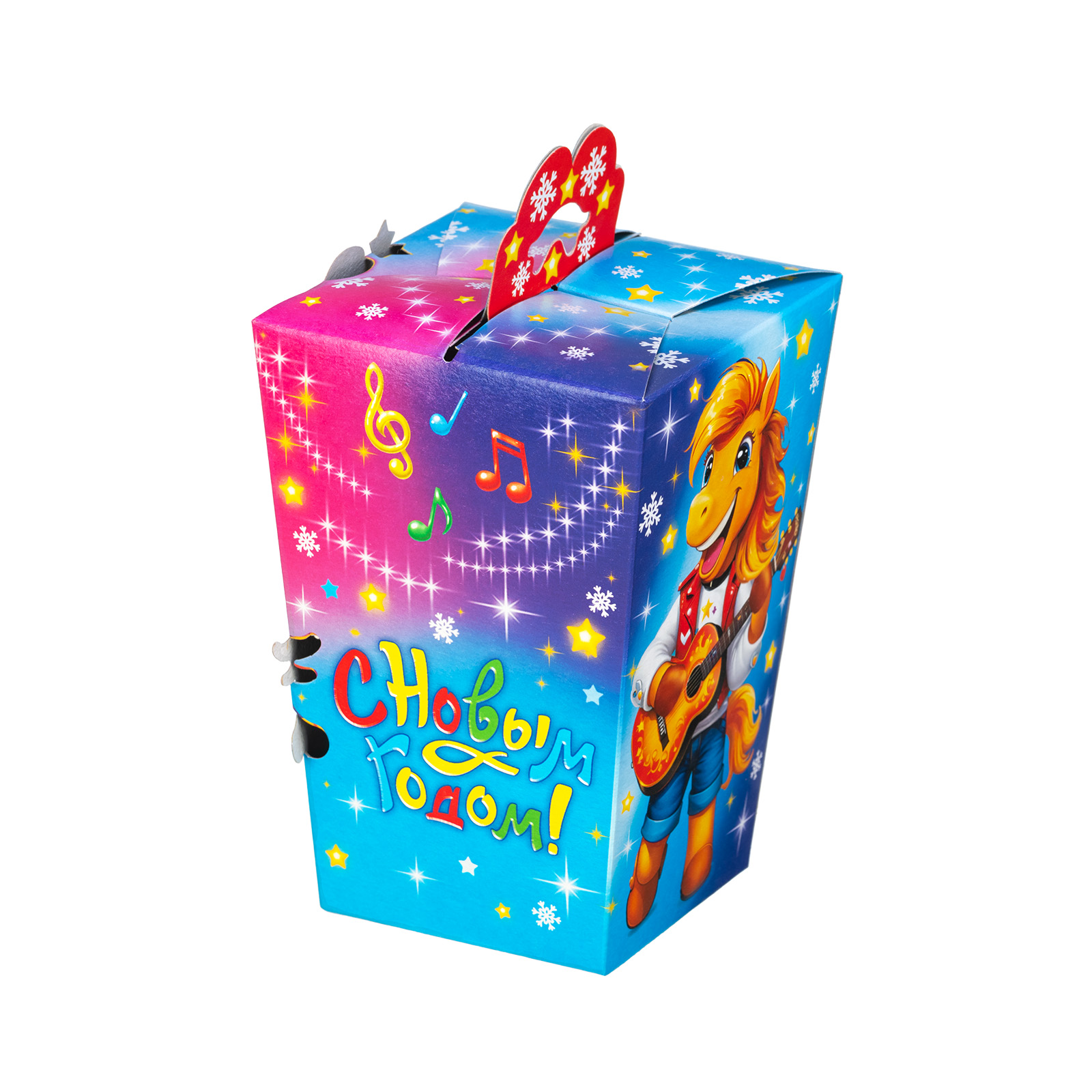Привлекательный новогодний сладкий подарок, который станет идеальным дополнением к любому новогоднему празднику в школе или детском саду. Подарочная упаковка из качественного плотного картона выполнена в форме небольшого фонарика с удобной ручкой. Упаковка сочетает в себе холодные и теплые оттенки, что создает особое праздничное настроение. На одной из сторон мы видим яркий рисунок - крошку-лошадку в праздничном платьице, которая искренне радуется приближению новогодней ночи.  В набор входит более 30 разнообразных сладостей  и небольшой памятный сувенир.