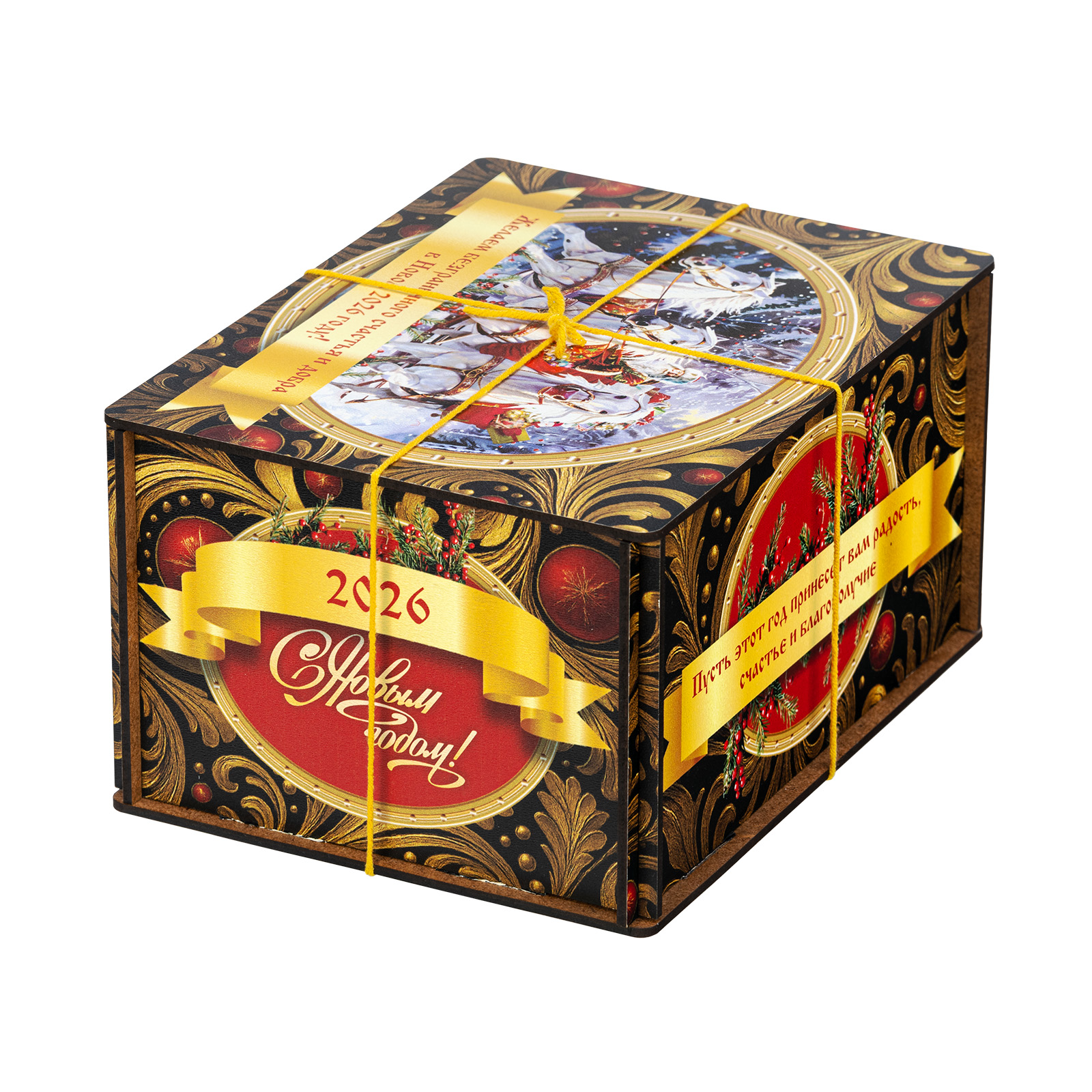 Ищете новогодний сладкий подарок для взрослого сластены? Тогда набор “Посылка Черный бархат” - это то, что вам нужно! В его состав входит целых полтора килограмма разнообразных отборных сладостей на любой вкус! В нем есть шоколадные конфеты с самыми разнообразными начинками, батончики, печенье, халва, а также многие другие любимые лакомства. Кроме сладкого наполнения, в состав подарка входит небольшой памятный сувенир в виде символа наступающего года. Все это бережно упаковано в празднично украшенный деревянный ящичек, перетянутой ярко-желтой ручкой-шнурком. Прям настоящая волшебная посылка!