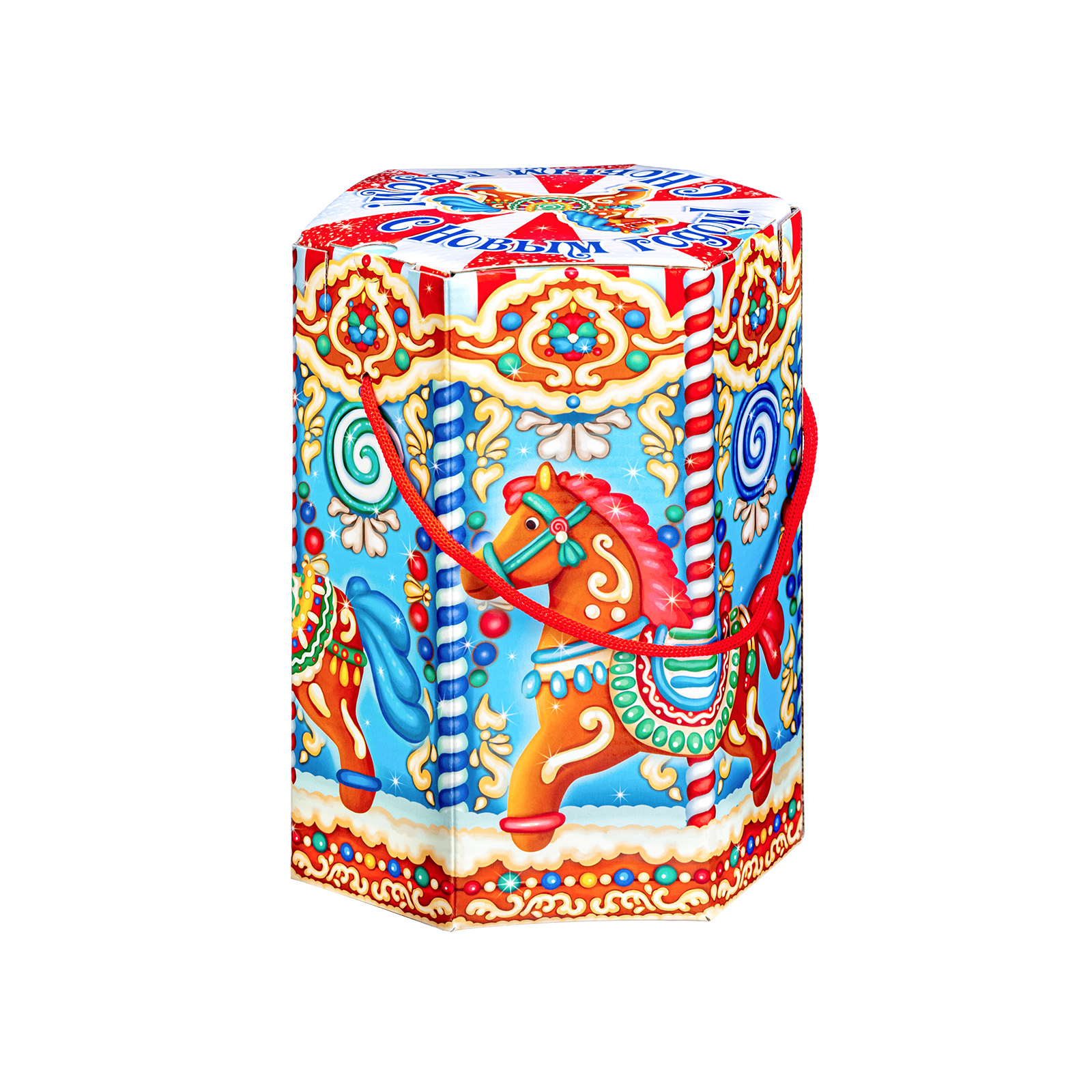 Интересный вариант новогоднего подарка – «Пряничная карусель». Он представлен в разделе Картон. Отлично подойдет на подарок в 2026 году с символом Лошадь. Внутри такого презента находится кондитерский набор весом 800 граммов.